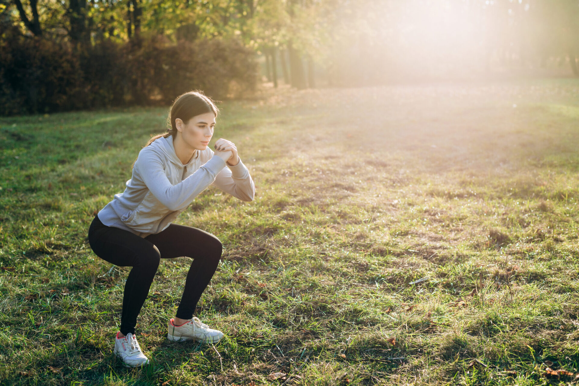 Squats: Place your feet shoulder-width apart, squat down until your thighs are parallel to the floor, and stand back up.